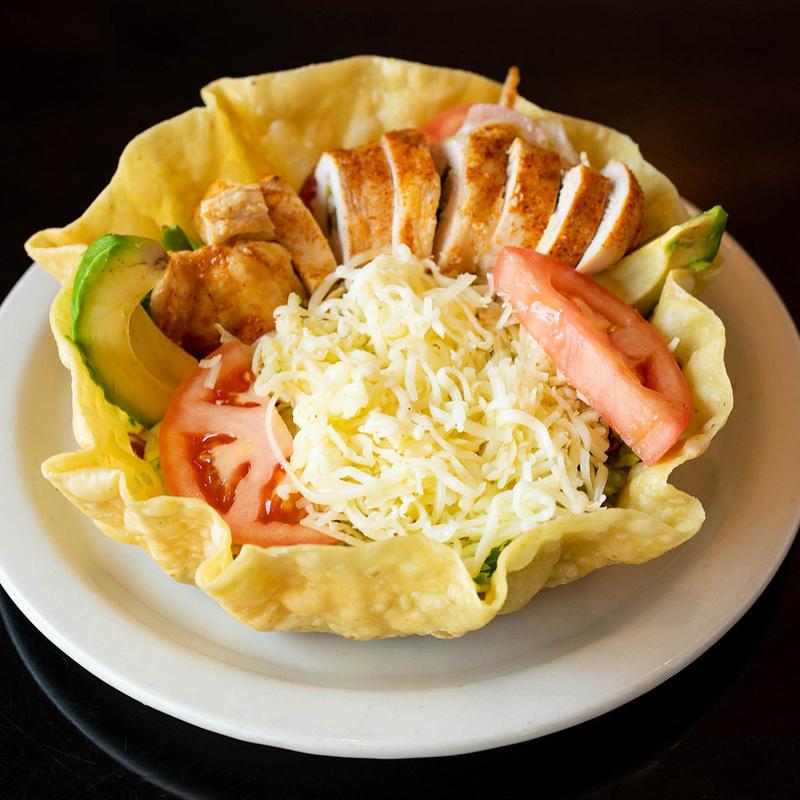 Your choice of taco meat or seasoned, shredded chicken. Served in a tortilla taco bowl holding a bed of crisp lettuce, tomatoes, avocado slices, cheddar cheese & your favorite dressing.